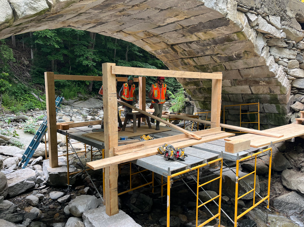 The West Townshend Stone Arch Bridge, originally built in 1910 by local mason James Otis Follett, is a historic landmark listed on the National Register of Historic Places. This restoration project, led by Standing Stone with our team’s involvement, aimed to preserve the structural and historical integrity of this remarkable bridge. Supported in part by a grant from the National Park Service, the renovation carefully balanced modern techniques with traditional craftsmanship to honor its original construction.